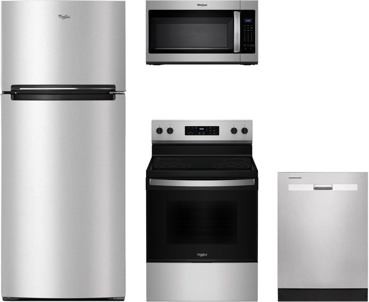 Whirlpool® 4 Piece Stainless Steel Kitchen Package with a top freezer refrigerator, freestanding electric range, built in dishwasher, over the range microwave.Read More