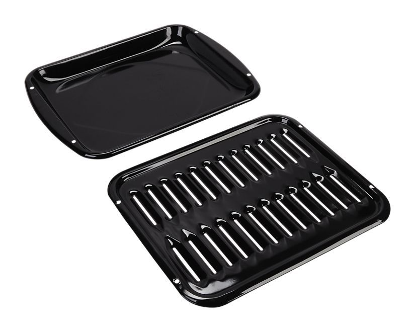 This set includes (1) black porcelain roasting rack, (1) black porcelain broiler pan.